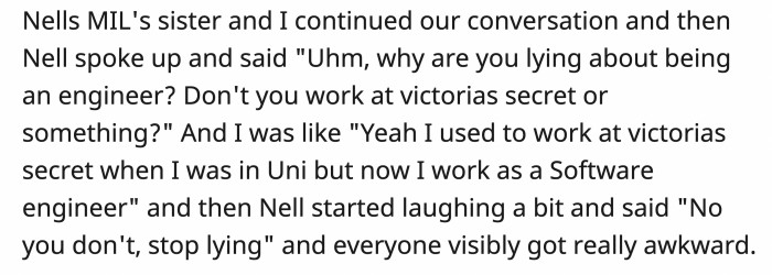 OP congratulated them on their new relationship milestone then she and the aunt went on with their conversation. Nell piped up asking, "Why are you lying about being an engineer? Don't you work at Victoria's Secret or something?"