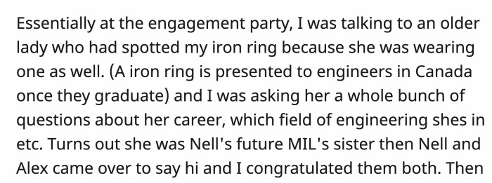 OP was asking Alex's aunt about her career and what field of engineering she works in. The newly engaged couple came over while the conversation was going on.