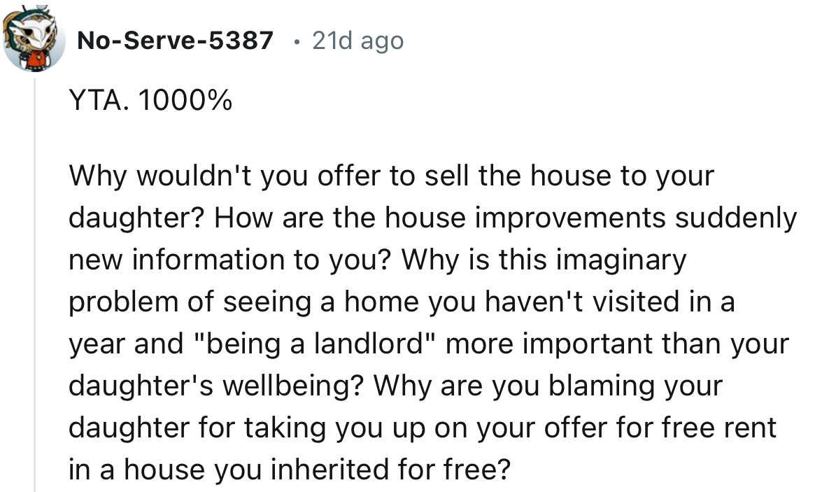“Why didn't you just ask your daughter to start paying rent to cover whatever its costing you financially?”