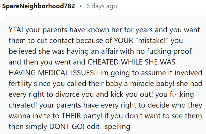 In the midst of the Reddit discussion, some users began to investigate OP's post history and found previous posts and comments that suggested he had cheated on Elle, which led to their divorce. This discovery added a new layer to the situation, as some Redditors argued that OP's behavior was the reason for the divorce and that he had no right to dictate who could attend his parents' party.