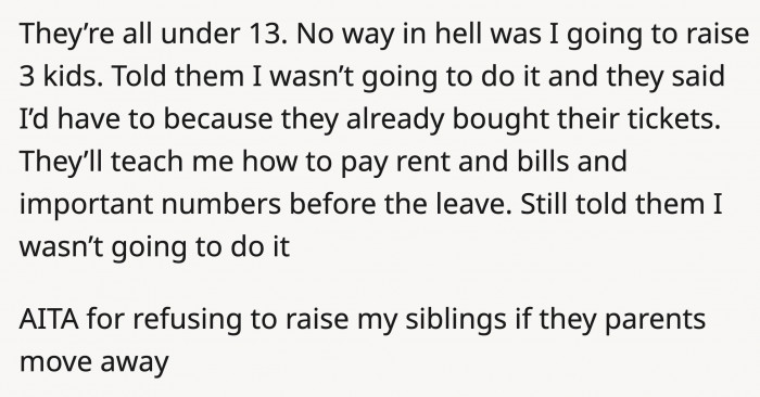 They told her not to worry because they would surely send her some money to pay for the bills and some for childcare. OP understands the weight of this responsibility and told them she would not be raising the three kids.