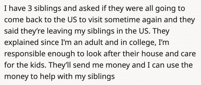 OP's siblings are all under the age of 13, and when she asked her parents if they were planning on returning to the US, their reply shocked her. Apparently, since OP is now legally an adult who is in college, she is mature enough to take care of the house and raise her three siblings by herself.