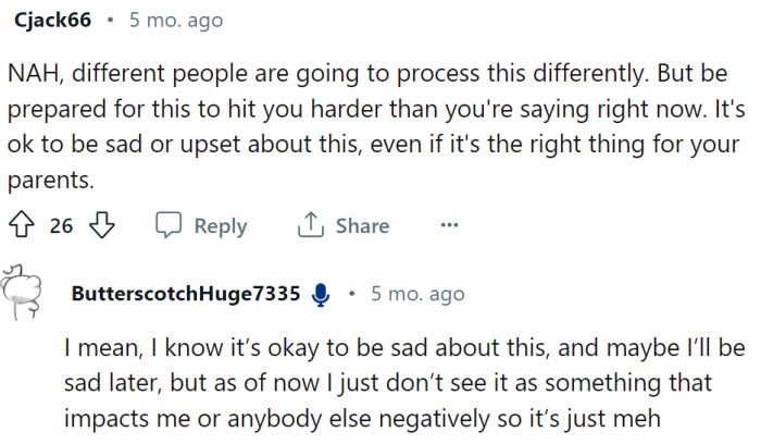He sees no reason to be upset about an amicable divorce, while she views it as a tragedy. It’s an interesting situation that highlights how differently family members can react to the same news.