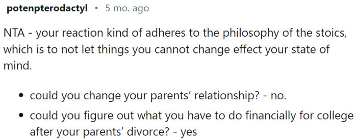 This young man's reaction to his parents' divorce is not heartless or wrong. Instead, it reflects a perspective that's both rational and perhaps a bit typical of his age.