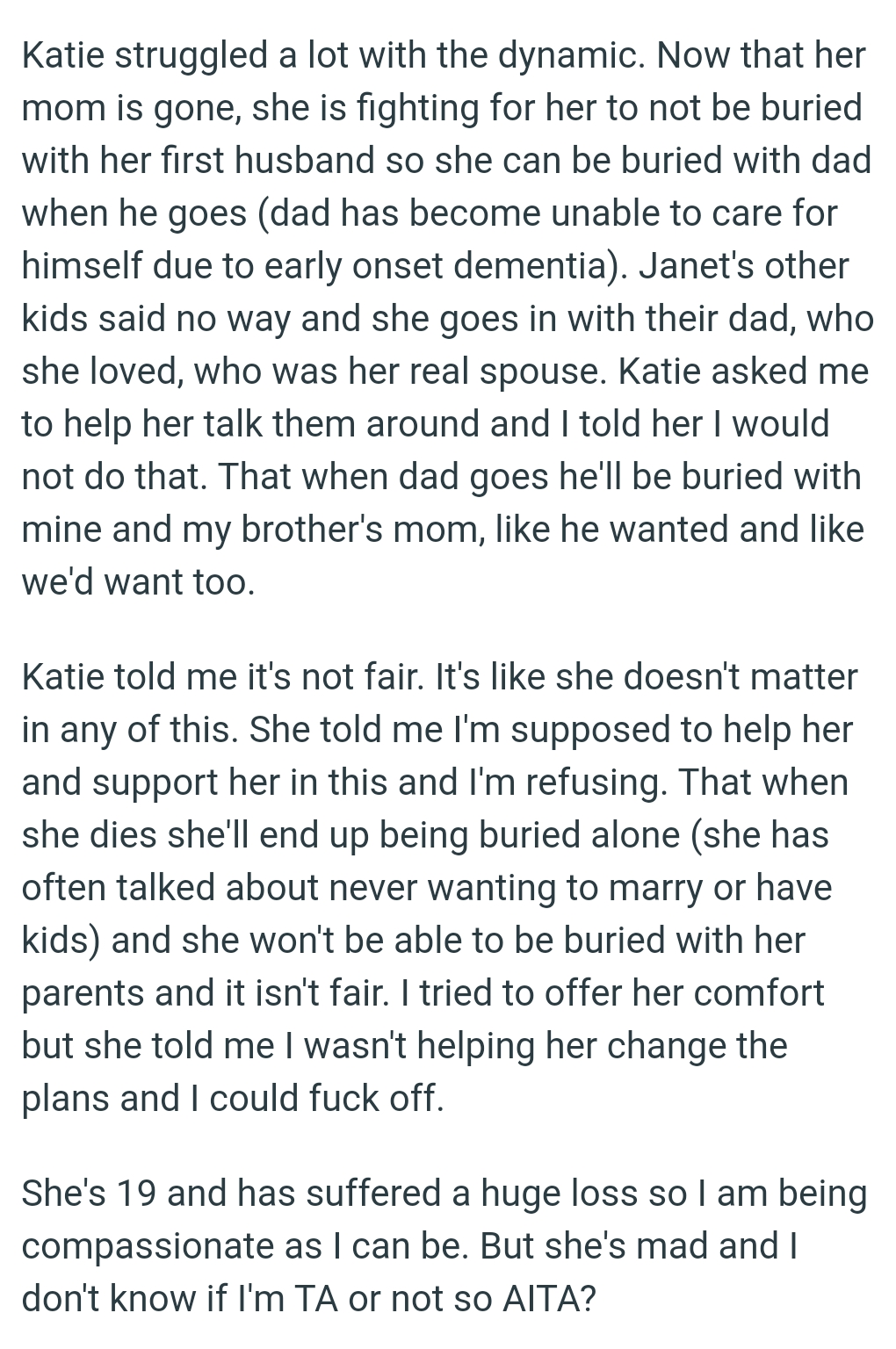 From an early point, both of them made it clear that if they were to pass away, they would want to be buried with their first spouses. Now that OP's stepmom is gone, Katie is fighting for her not to be buried with her first husband so she can be buried with her dad when he goes.