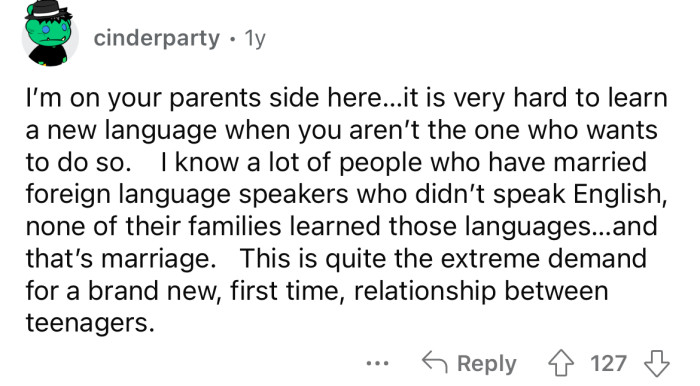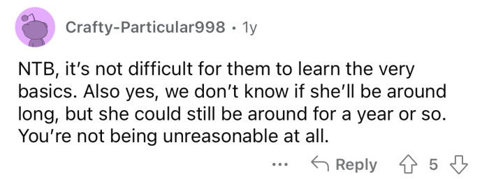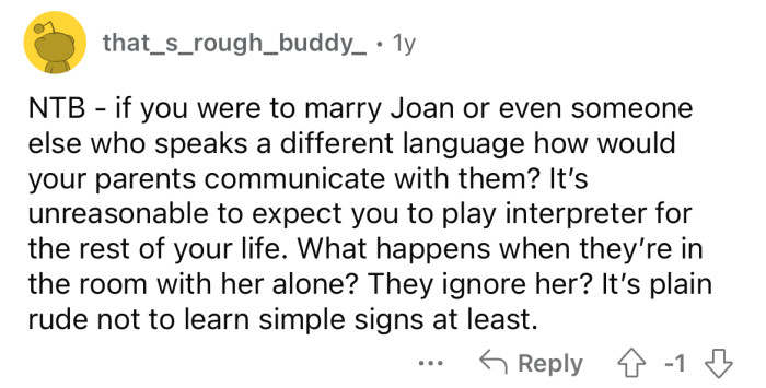 Recently, the OP's mom told her she was being unreasonable to expect them to learn a whole new language for someone who "won't be around for long." She said they were "too old" to learn it and that they had done well enough communicating with Joan thus far.