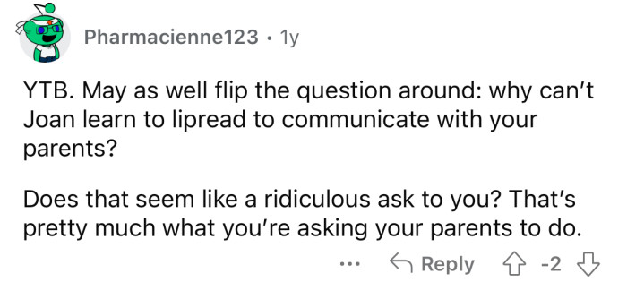But the OP is upset that her parents haven't learned ASL to communicate with Joan, who is deaf.