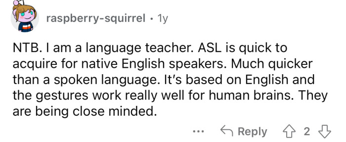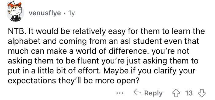 The Redditor says she has been offering to teach her parents ASL for almost a year now, but they always either change the subject or set a time and then cancel at the last minute.