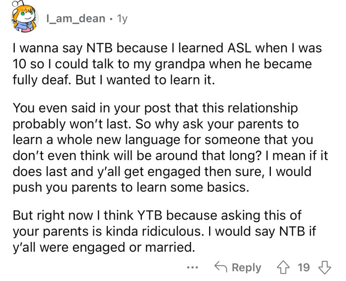 The OP asked if she's a buttface for asking her parents to learn ASL to communicate with her girlfriend.