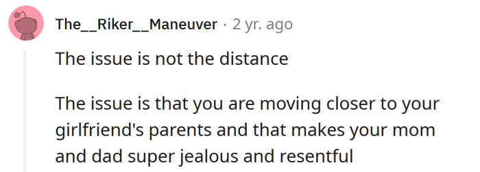 They seem to be jealous of the OP's girlfriend's family because they will be closer. The Redditor's sister also thinks it's a bad idea.