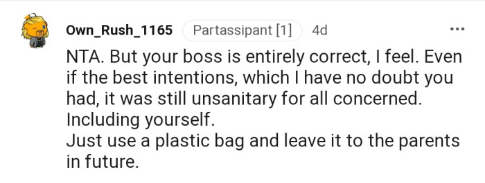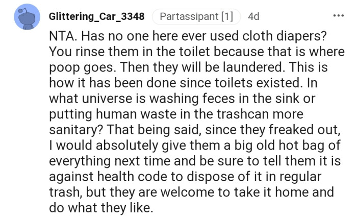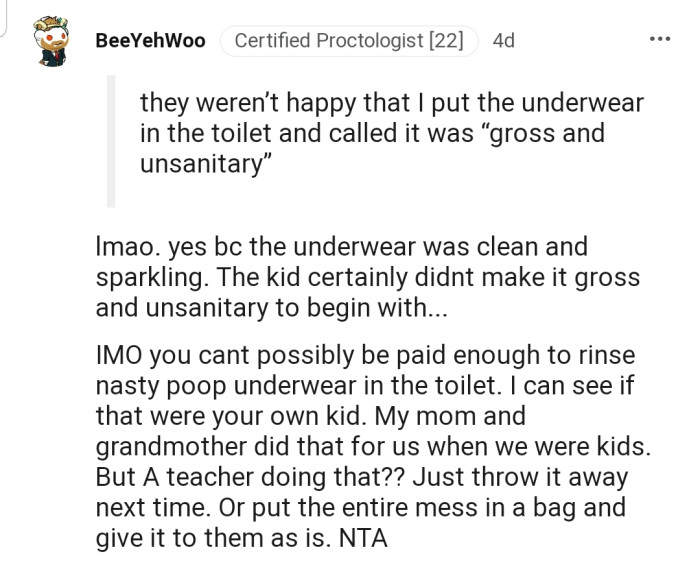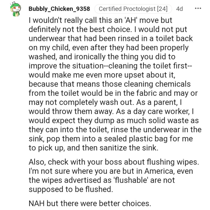The parents expressed their disgust at OP's method, deeming it "gross and unsanitary." Despite their explanations, the parents were adamant that the underwear should not have been rinsed in the toilet, as they feared it would teach their child bad habits.