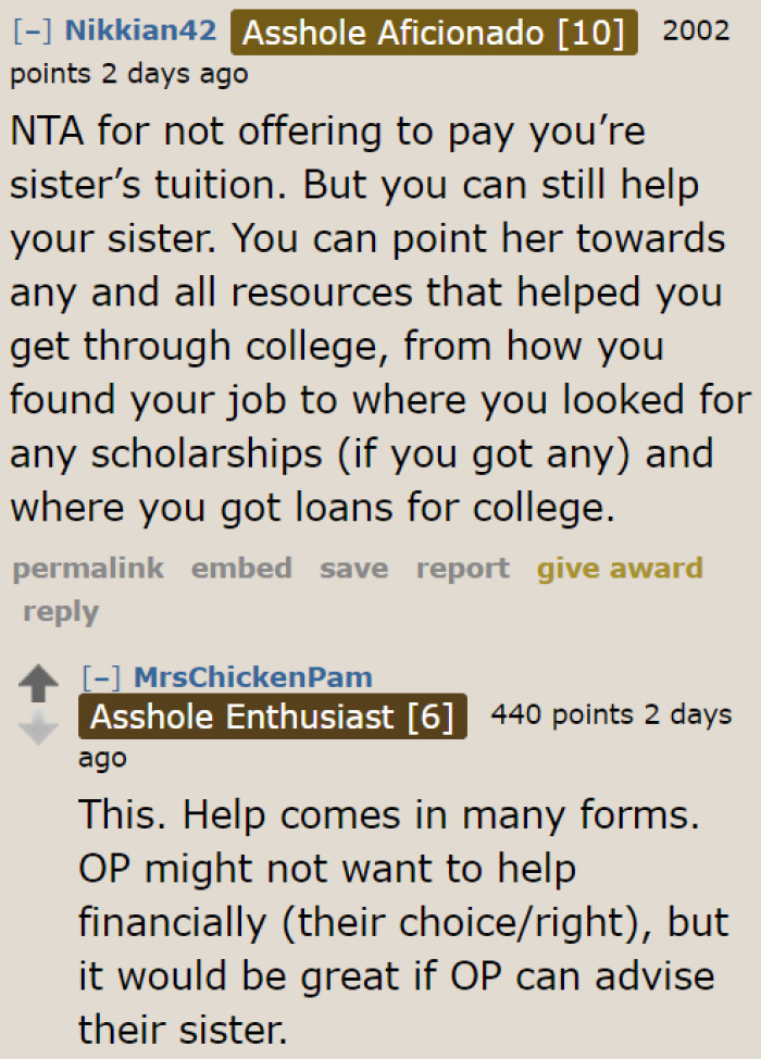 RedditShe reveals the reason why she refuses to support her sister: apparently, her parents didn't support her college education.