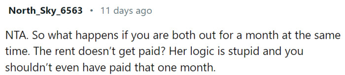 Most folks on Reddit seem to agree on this point. Even if the roommate isn't physically there, the apartment is still 'their spot,' and you can't just skip out on payments because you're taking an extended vacation. While the apartment might be a sweet deal for both of them, it's unfair for one person to shoulder the whole burden.