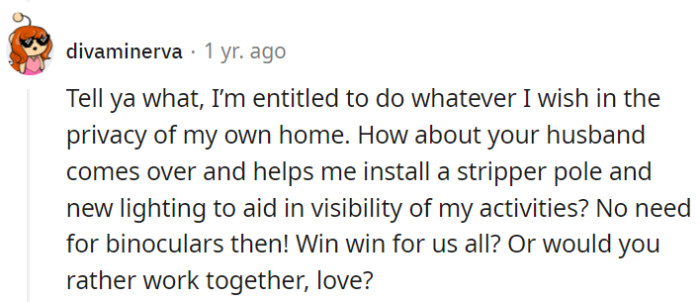 As tensions mount in this peculiar neighborhood standoff, OP's decision to link the return of the binoculars to the neighbor's wife has definitely raised questions about boundaries, accountability, and the true motivations behind this unsettling episode. We do applaud her for such a clever response, though!