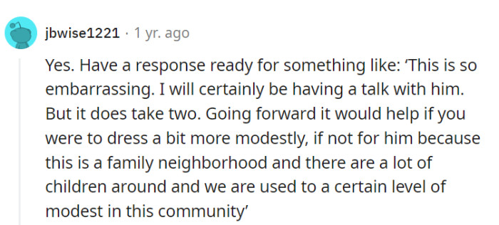If the neighbor's wife tries to deflect blame, firmly assert her right to a peep-free home and shut the door.