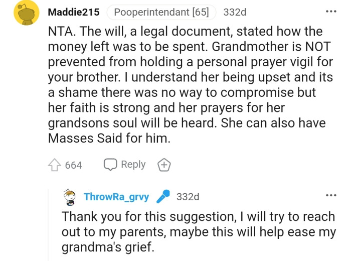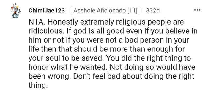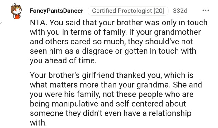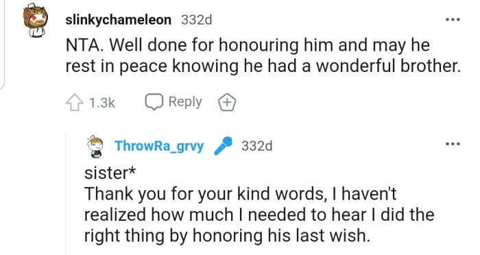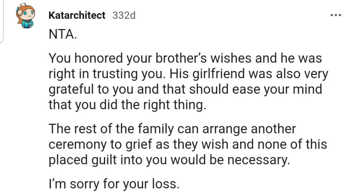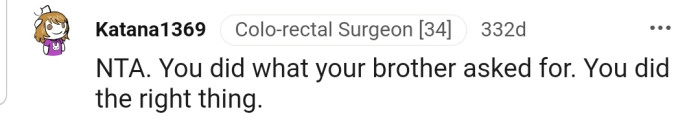 The commenters gave OP the enviable title of NTA and assured her she was right to follow her brother’s wishes.