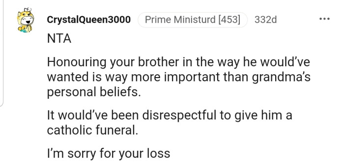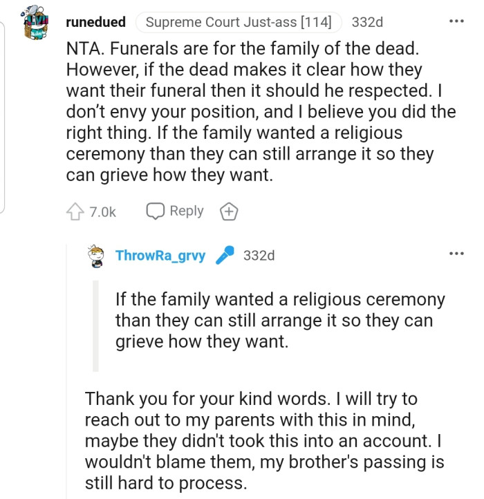 Reddit.comOP organized her atheist late brother's funeral according to his will