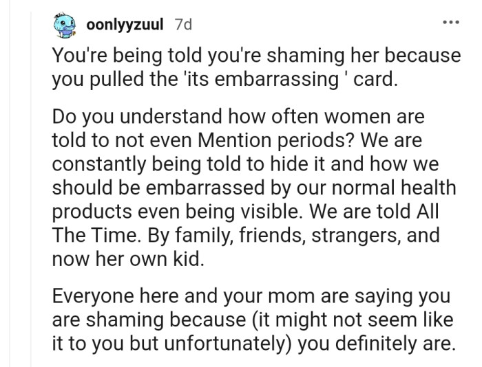 This internalization not only affects personal self-esteem but also contributes to broader societal stigma, as evidenced by the backlash the mother faced from the Reddit community. Addressing these ingrained beliefs through open dialogue can help normalize discussions around menstruation and reduce shame.