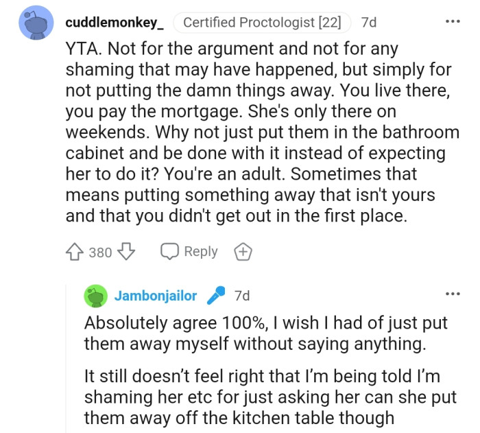 "She's only there on weekends. Why not just put them in the bathroom cabinet and be done with it"