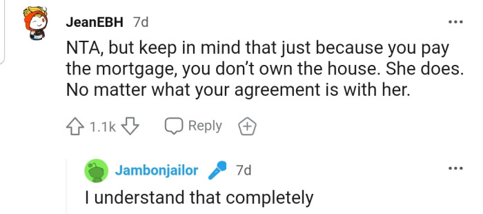 "NTA, but keep in mind that just because you pay the mortgage, you don’t own the house."