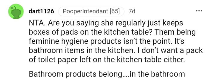 A majority of the commenters believe that OP is NTA. This is because they believe period pads are meant for the bathroom, and shouldn't be anywhere near a kitchen meant for meals.