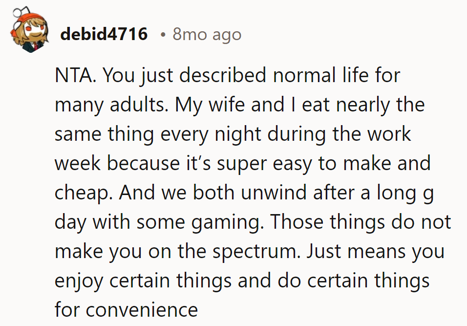 He enjoys familiar routines, such as eating Trader Joe's Indian meals and playing a specific video game daily, and he needs occasional breaks from loud clubs due to sensory overload. His friend interprets these behaviors as signs of autism, despite his assurances and a decade of therapy for depression and anxiety without any professional suggesting he might be autistic.