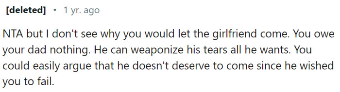 Now, eager to bask in the glory of her success, he is suddenly keen to be involved. On the other hand, OP's mother, described by OP as a narcissist, views the attendance of her ex-husband's girlfriend as a personal attack.