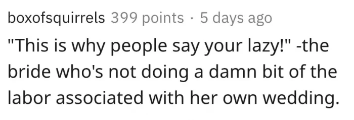 “Is there anything I can say that you’ll actually do?” the aunt asks. “Everyone else has been rushing to help us. The smaller jobs are things like designing and creating reminders for guests and the final seating plan, but as they are smaller, I’d prefer both done together.”