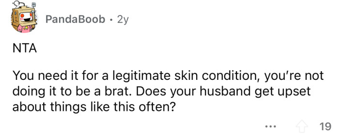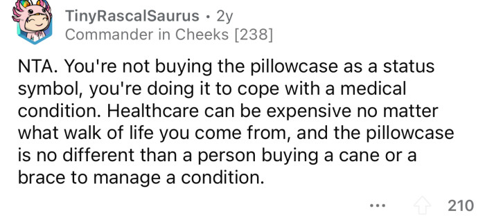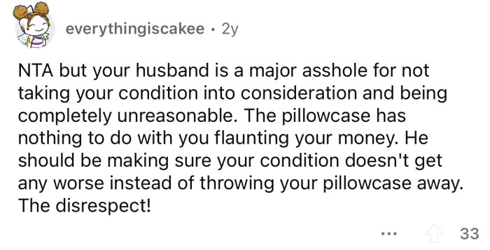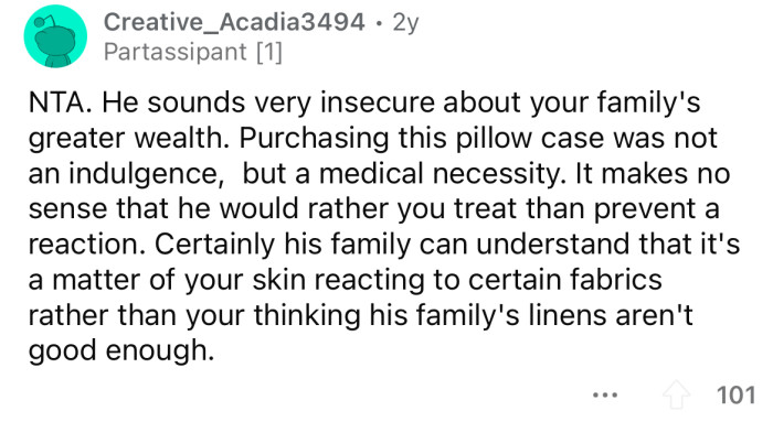 However, when the pillowcase arrived, the OP's husband was very upset about it. He said the OP was "flaunting" her ability to make an expensive purchase and "shaming" his family for having pillowcases of lesser quality.