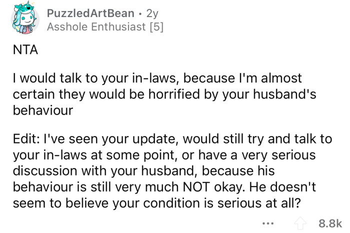Reddit/Dry-Seaweed-4115She explained that she and her husband recently went to stay with his parents for two weeks.