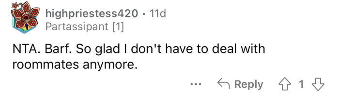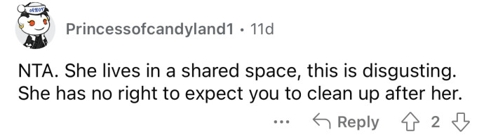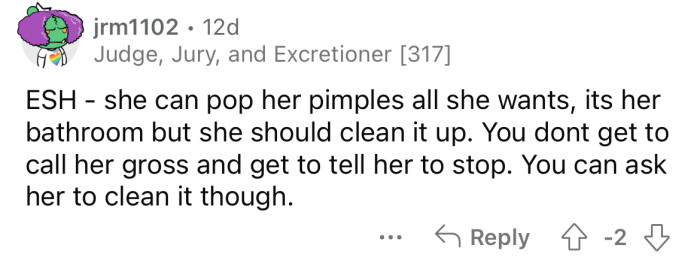 The OP confronted the roommate, saying, "Ew, that's super gross; you need to knock it off!" But the roommate was offended and asked, "What's the point of paying such high rent if I can't even treat this place like my own home?"