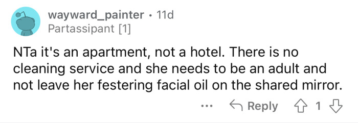 They share a bathroom, and the OP does the majority of the cleaning. Recently, the Redditor noticed that she had to clean the bathroom mirror much more often since the new roommate moved in.