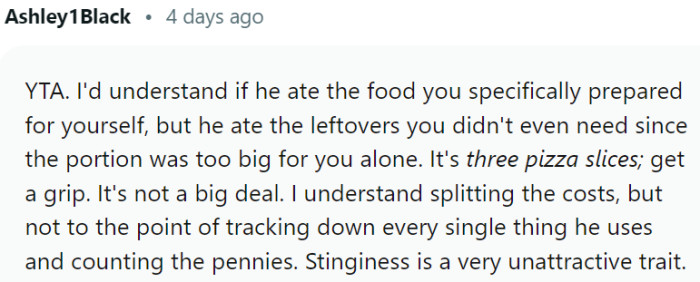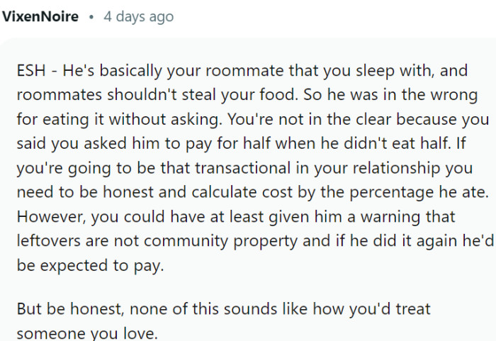 "If you're going to be that transactional in your relationship, you need to be honest and calculate cost by the percentage he ate."