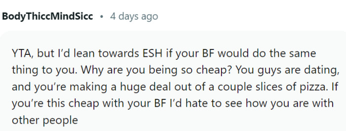 The following day, OP discovered that her boyfriend had eaten the leftover pizza without her permission. She confronted him, asking him to pay her back for half of the pizza since she had paid for it herself.