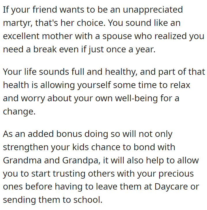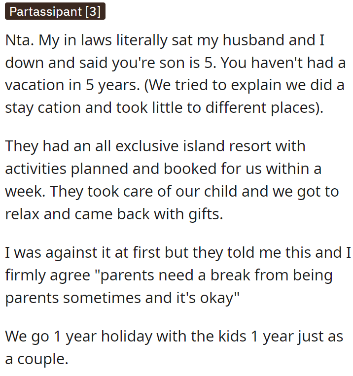 Encouraged by this positive experience, OP and her husband planned another trip for the following year. The decision, however, was met with criticism from a friend who could not fathom leaving her child behind for a vacation.