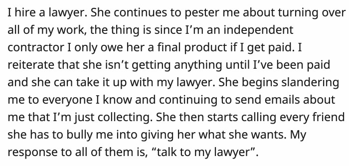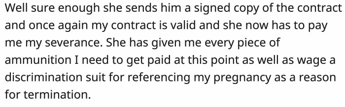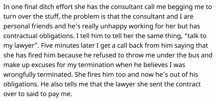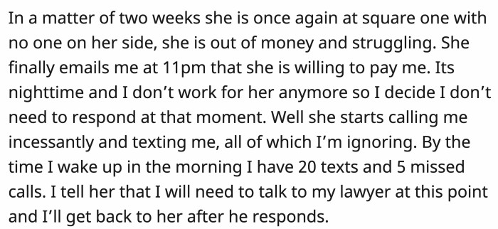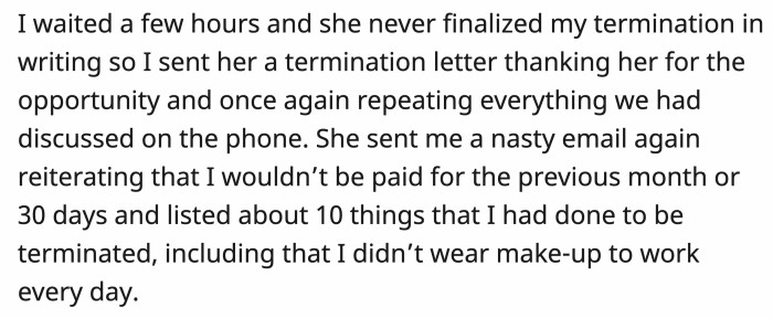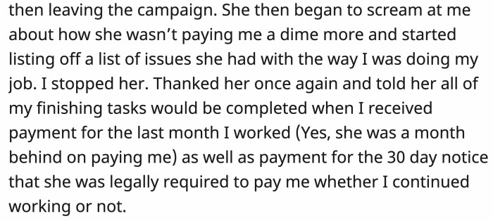 OP stopped the tirade and told her that her tasks would be completed once she received her late salary from the previous month, as well as pay during the 30-day notice period. OP waited for a few hours for the formal termination, but nothing came.