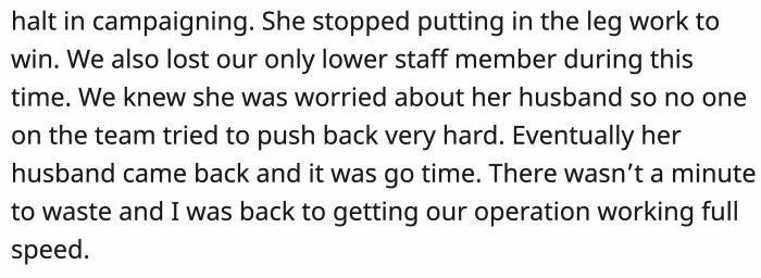 Once her husband came home, the candidate was once again all in. OP and the rest of the team had to work double to regain their momentum.