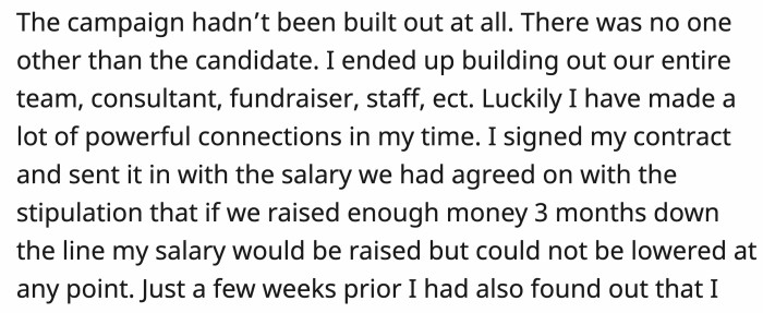 She had to use her connections to build the team and their campaign from the ground up. She signed her contract with the agreed-upon salary, with the stipulation that if they raised enough funds in three months, OP would receive a sizable raise, but at no point could her pay be lowered.