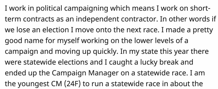 OP was the youngest campaign manager to run a statewide race in her state in over 20 years. She is 24 years old and already at the top of her chosen career.