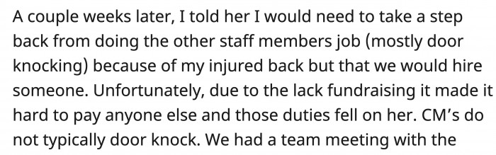 "I told her I would need to take a step back from doing the other staff members' jobs."