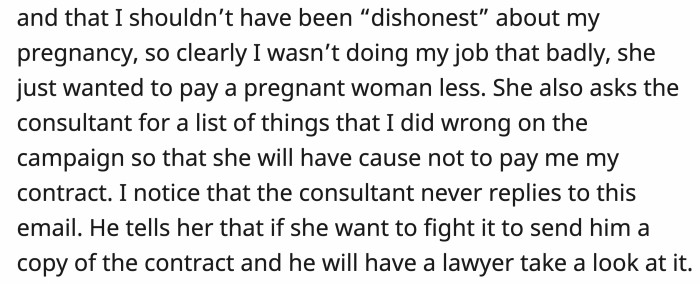 “Since you are pregnant and can no longer door knock, you can either work for (state minimum wage) or you can find a new job.”