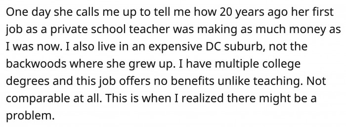 Out of the blue, the candidate called OP to tell her that when she worked as a private school teacher 20 years ago, she was making twice what OP was earning. OP's alarm bells started to blare very loudly, and she realized something was not right.