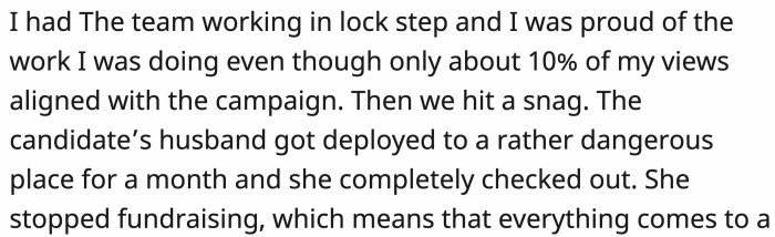 OP was proud of what she had accomplished for her candidate, despite the fact that their principles didn't align. However, when the candidate's husband was deployed to a dangerous area, the politician stopped working on her campaign.