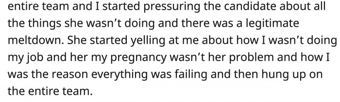 The entire team was called in for a meeting, and OP began to list everything the candidate was failing to do, at which point she snapped in front of everybody. She yelled about how OP was not doing her job and how OP's pregnancy was not her fault.