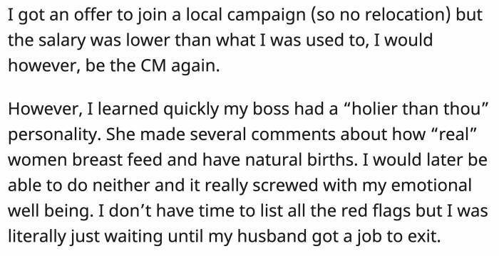OP accepted the offer, but she soon found out that the politician she was working for was not her cup of tea. The female politician was preaching unsolicited advice about how real women are supposed to give birth naturally and breastfeed their babies.