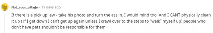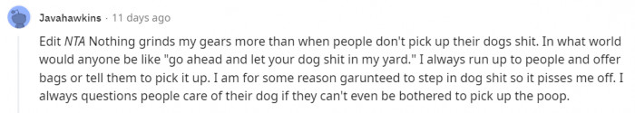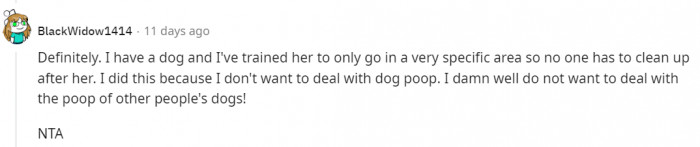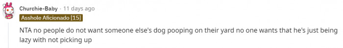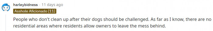 The comments section all agree that the dog owner, and not OP, is the A$$hole, as owning a dog comes with responsibilities, including cleaning up after your dog.