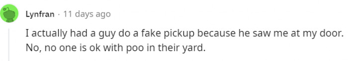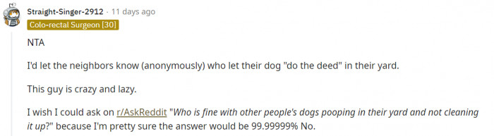 OP shared that he had recently moved into a new neighborhood, and while taking a walk with his dog, he spotted a stranger’s dog taking a dump in someone’s yard.