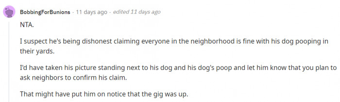 "I'd have taken his picture standing next to his dog and his dog's poop and let him know that you plan to ask neighbors to confirm his claim"