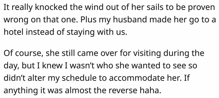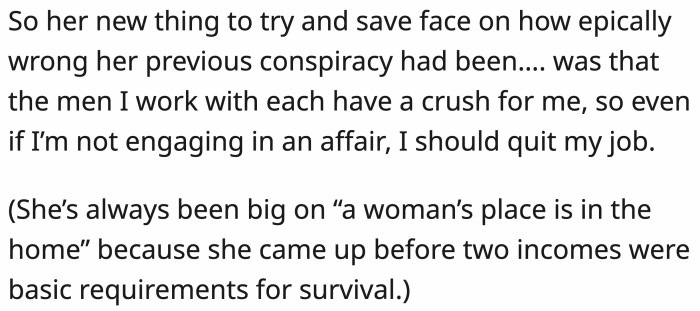 OP’s husband had his mother stay at a hotel and would only visit during the day. She tried to save face by saying that even if OP wasn’t having an affair with her co-workers, she should quit her job to be a full-time housewife.