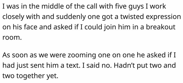 Until one of the guys clearly made a face and asked her to join him in the breakout room. He asked if she had texted him, and when she denied it, the co-worker showed a text from her phone asking him to send a dirty picture.
